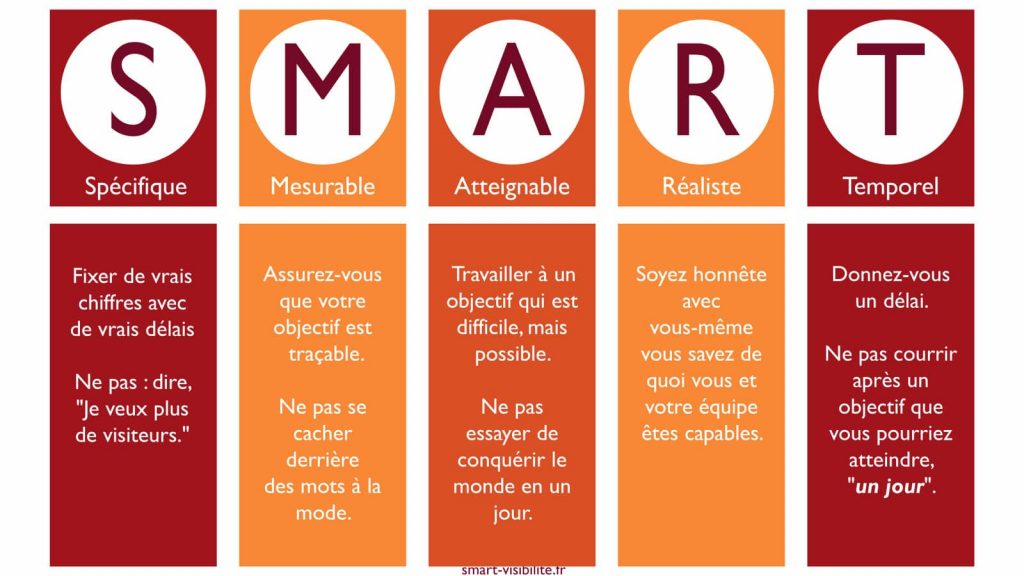L’acronyme SMART signifie Spécifique, Mesurable, Acceptable/Atteignable, Réaliste et Temporellement défini. La mise en pratique d’un objectif smart s’applique dans différents domaines tels que la gestion de projet, le management, le marketing, mais aussi l’Inbound marketing.