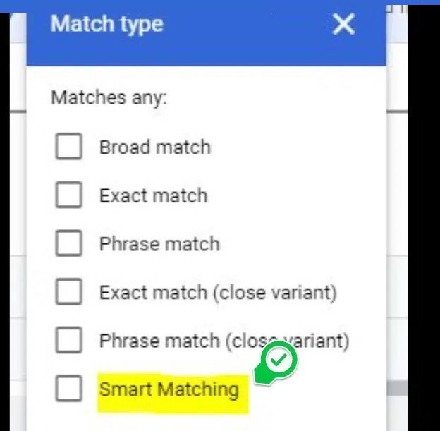 - Search Term Matching : élargit le ciblage des mots-clés en utilisant vos inputs (mots-clés, créas, URLs).