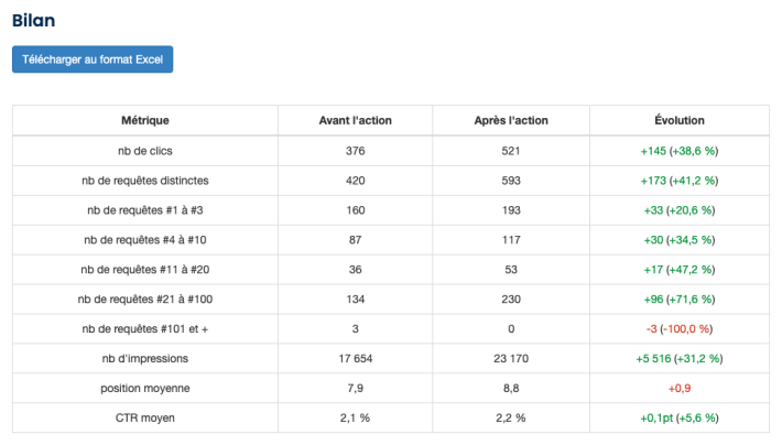 Dans le module « maillage interne » c’est encore mieux ! Quand vous avez terminé d’indiquer les liens internes que vous avez ajoutés (en suivant les recommandations de l’outil), il suffit d’un seul clic sur un bouton. Et 6 semaines plus tard vous avez les résultats (ou avant, des résultats temporaires).