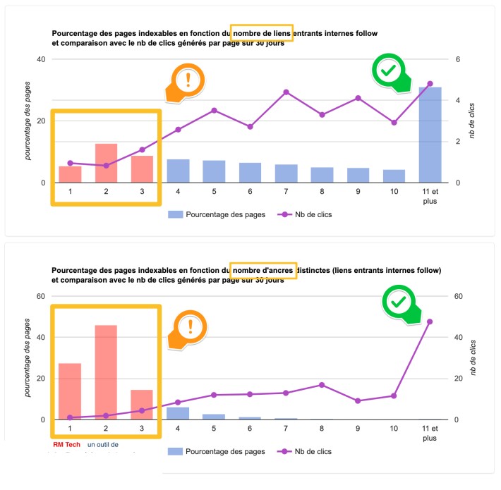 RM Tech combine les données calculées après le crawl et celles issues de Google Search Console. C’est très pratique pour voir immédiatement si, pour le site étudié, les pages qui génèrent le plus de trafic sont aussi celles qui ont un bon maillage interne.