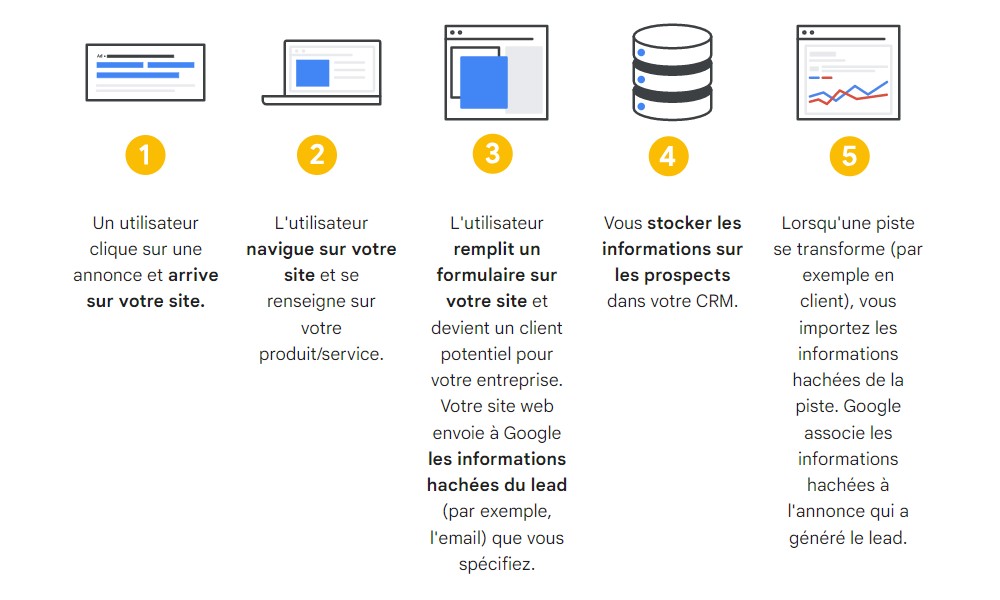 Jusqu’ici ce suivi des conversions hors-ligne était possible uniquement pour les annonceurs en capacité de conserver l’ID de clic Google (GCLID). Un système demandant un développement parfois lourd à mettre en place. Grâce au suivi avancé des conversions, il est possible d’utiliser les mêmes données first party issues des conversions sur votre site web, pour importer vos conversions hors-ligne. Ce qui permet de limiter les coûts de développement côté CRM.
