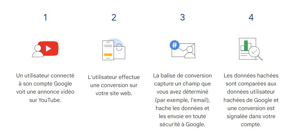 Contrairement au suivi des conversions standard, le suivi avancé se base sur les données first party récoltées pour améliorer la mesure. En effet, ce paramètre supplémentaire envoie sous un format haché ces données, afin de permettre à Google de mieux mesurer les conversions, notamment lorsqu’elles font suite à l’interaction d’une personne connectée à un compte Google avec vos annonces. L’outil gagne ainsi en précision pour consolider le parcours utilisateur que ce soit pour des conversions post-clic ou post-view, mais aussi multi-appareils.